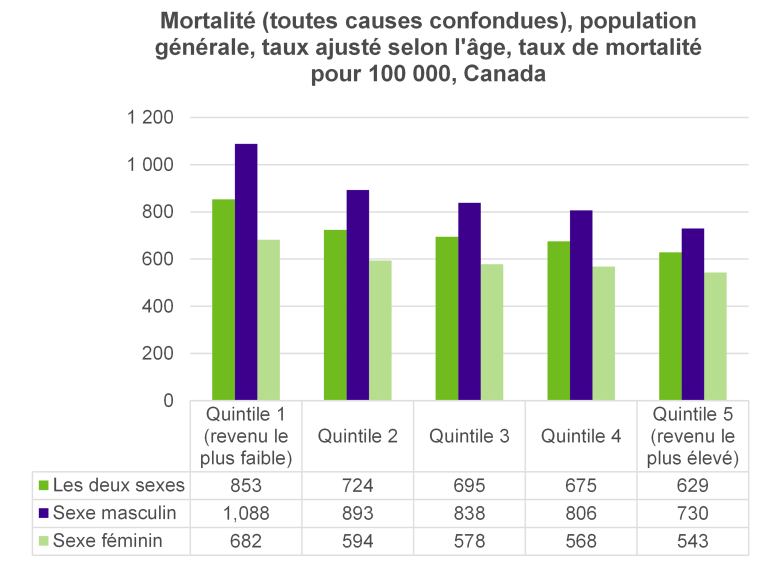 Comme l’illustre le graphique ci-dessous, pour la période entre 2016 et 2020, les taux de mortalité, ajustés selon l’âge, au Canada pour le quintile de revenu le plus faible ont dépassé ceux du quintile de revenu le plus élevé de 35% pour les deux sexes et de près de 50% pour le sexe masculin.