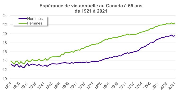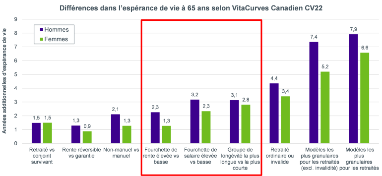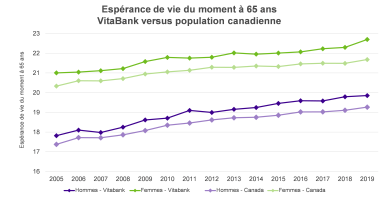 Notez bien : Les espérances de vie indiquées ci-dessus ne tiennent compte que de la mortalité entre 65 et 94 ans. Les données de VitaBank sont basées sur les retraités et les survivants dont les dossiers sont complets et fiables de 2005 à 2019. Les résultats canadiens sont basés sur les données annuelles de décès de Statistique Canada et sur les estimations de la population au 1er juillet.
