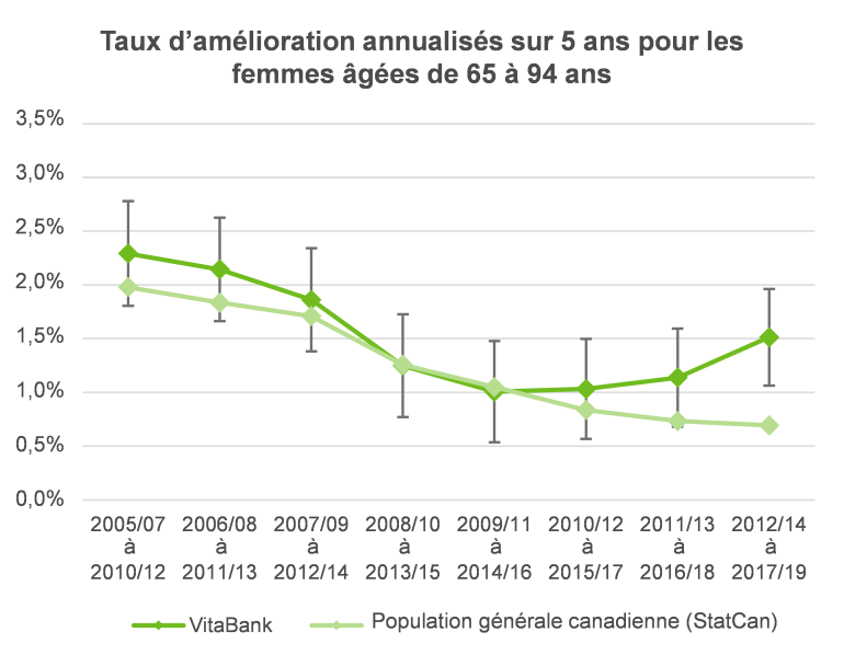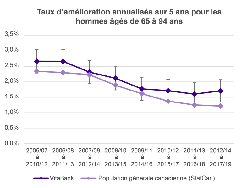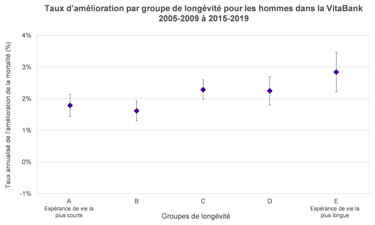 Notre analyse confirme que les améliorations de la mortalité observées dans la VitaBank sont supérieures à celles de la population générale. Il convient toutefois de noter que l’écart se situe généralement à l’intérieur d’un intervalle de confiance de 90 %. Par conséquent, notre rapport devrait être considéré uniquement à des fins indicatives, plutôt qu’être considéré statistiquement significatif.