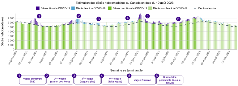 La surmortalité au Canada (selon les prévisions prépandémiques) demeure élevée depuis le début de la pandémie, la première vague de décès survenant en mars 2020. Le graphique ci-dessous présente les estimations de décès par semaine entre janvier 2020 et août 2023 pour toute la population canadienne (nous notons que le moment et l’ampleur des vagues pandémiques varieront également en fonction des zones géographiques au Canada). La ligne pointillée représente le nombre de décès attendus selon les attentes prépandémiques, calculé et publié par Statistique Canada sur la base des données recueillies entre 2016-2019. Les décès excédentaires sont ceux qui dépassent la ligne pointillée des décès attendus du graphique.