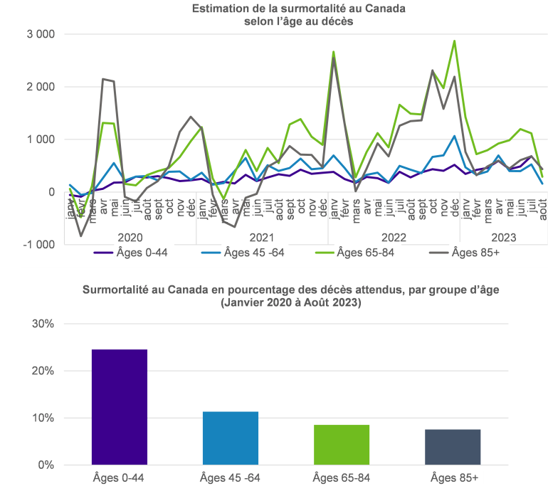 Les graphiques ci-dessous présentent la surmortalité au Canada par groupe d’âge.