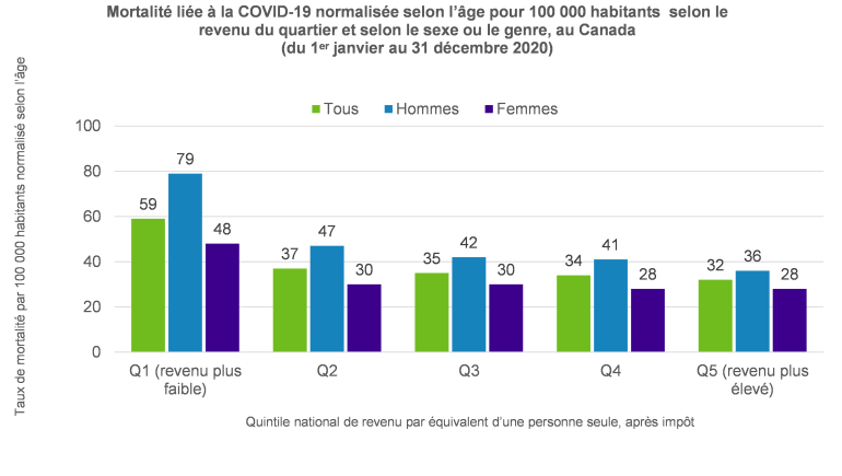 Comme l’indique le rapport intitulé Inégalités sociales des décès liés à la COVID-19 au Canada, par caractéristiques individuelles et locales publié en 2022 par l’Agence de santé publique du Canada, les données suggèrent que les conséquences de la pandémie de COVID-19 ont touché de manière inégale les différents groupes de la population canadienne. Le graphique suivant présente la mortalité due à la COVID-19 au Canada en fonction de l’âge par revenu et par genre en 2020 et met en évidence l’écart important entre les groupes de personnes à revenu faible et ceux à revenu élevé.