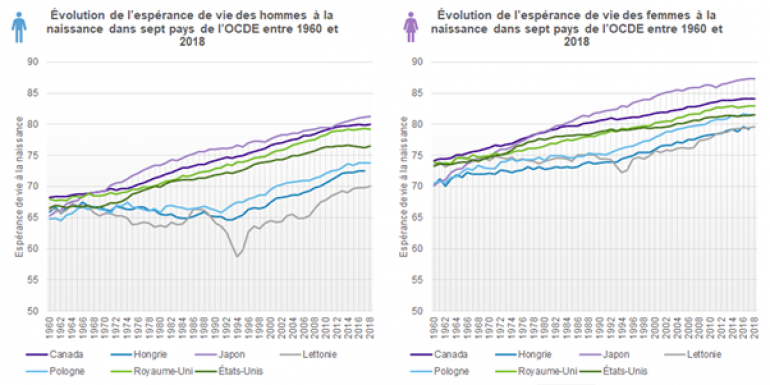 L’illustration ci-dessous montre l’évolution de l’espérance de vie à la naissance pour sept pays de l’Organisation de coopération et de développement économiques (OCDE) : le Canada, la Hongrie, le Japon, la Lettonie, la Pologne, le Royaume-Uni et les États-Unis. Dans ces sept pays, l’espérance de vie des hommes à la naissance variait entre 64,8 ans et 68,2 ans en 1960, et entre 69,8 ans et 81,1 ans en 2017, ce qui indique une augmentation de l’inégalité de l’espérance de vie de près de huit ans entre ces pays sur cette période. Pour les femmes, l’augmentation était d’environ quatre ans. L’inégalité de l’espérance de vie est plus manifeste et préoccupante si l’on considère, par exemple, les pays en développement d’Afrique, dont l’espérance de vie moyenne était d’environ 63 ans en 2019.