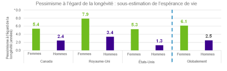 Dans l’ensemble, les répondants à notre récente Enquête sur la perception de la longévité, du mode de vie et de la retraite, 2022 sous-estiment largement leur espérance de vie, ce qui illustre un phénomène connu sous le nom de « pessimisme à l’égard de la longévité ». Cette réalité se reflète tant chez les hommes que chez les femmes au Canada, au Royaume-Uni et aux États-Unis, plus particulièrement chez les femmes, et ce, de façon plus prononcée au Royaume-Uni et moins prononcée aux États-Unis.