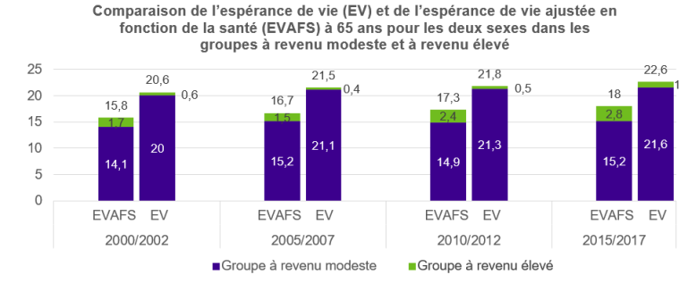 Le graphique ci-dessous compare l’espérance de vie et l’espérance de vie ajustée en fonction de la santé (sans tenir compte des améliorations futures) à 65 ans pour les deux sexes dans les groupes à revenu modeste et à revenu élevé au Canada. La partie verte de chaque barre indique l’écart entre les groupes à revenu élevé et les groupes à revenu modeste.