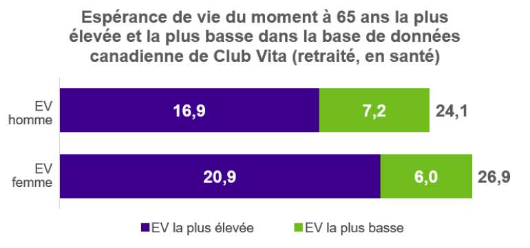Selon la base de données canadienne de Club Vita, si l’on tient compte de divers facteurs comme l’aisance, le mode de vie, l’état matrimonial et la profession, l’écart d’espérance de vie entre deux personnes est beaucoup plus important que ce qui est indiqué ci-dessus. Le tableau ci-dessous illustre la fourchette de l’espérance de vie possible à 65 ans d’un retraité canadien figurant dans la base de données de Club Vita. La partie verte de chaque barre indique l’écart entre l’espérance de vie la plus élevée et la plus faible.