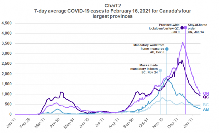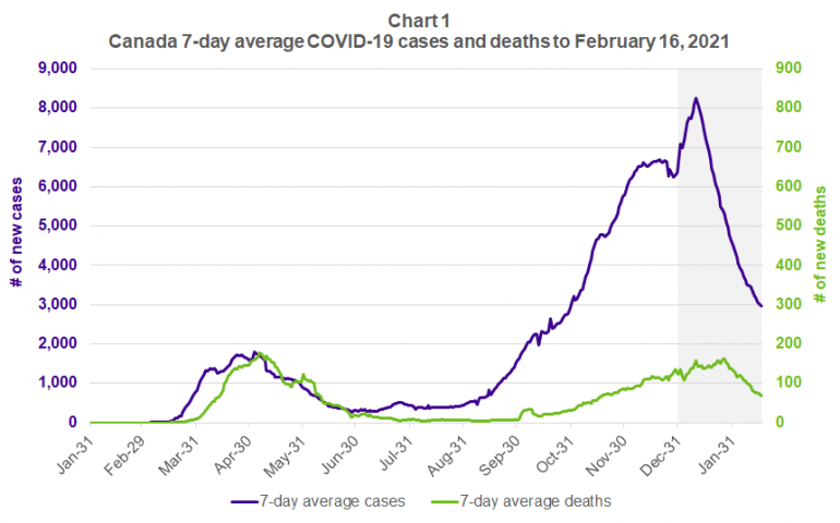 Chart 1 below shows the progression of the average daily number of new cases (purple line) and deaths (green line) in Canada up to February 16, 2021. Unfortunately, early January saw cases spike further upward after briefly plateauing in December, with average daily deaths climbing close to the highs reached during the first wave. While the level of new cases and deaths are still concerning, it is very good to see the significant declines over the latter half of January and into February.