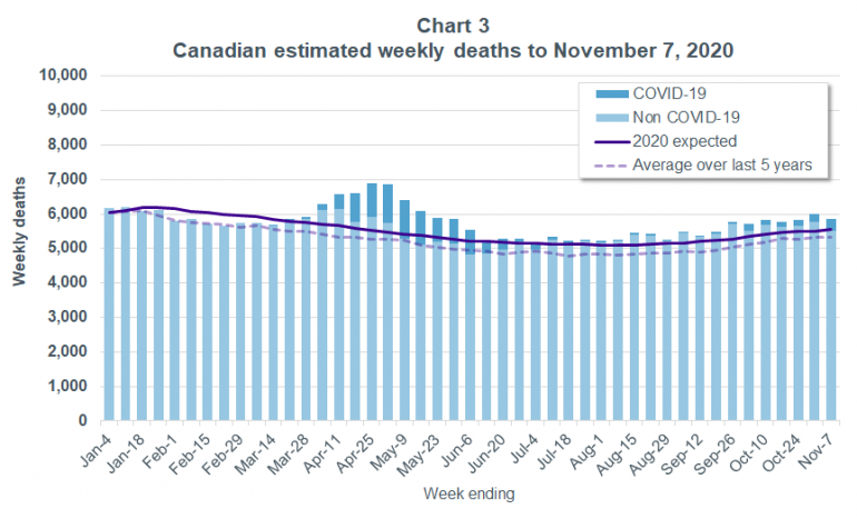 • Weekly deaths were below Statistics Canada’s expectations until early March, were then above expected through April and May (with the increase appearing to be largely attributable to COVID-19 deaths), and weekly deaths were around Statistics Canada’s expectation from June to August before moving somewhat higher than expected in September.
