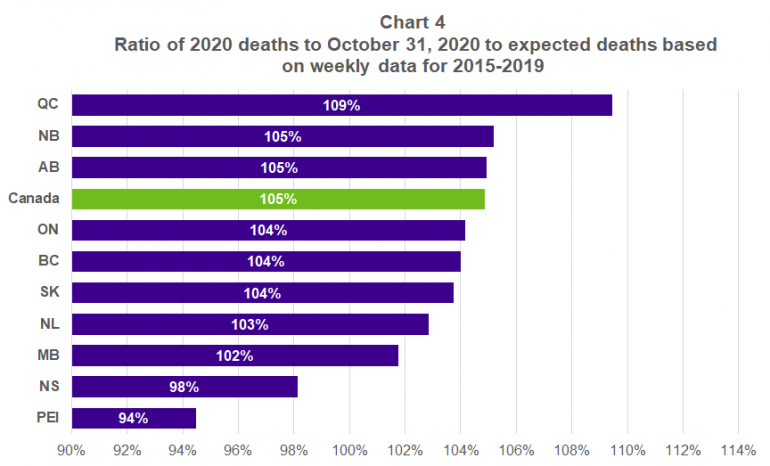 Chart 4 shows the ratio of 2020 cumulative weekly deaths to Statistics Canada’s expected deaths for each province to October 31 (latest week with data available for Ontario). Contrasting Chart 4 with the corresponding chart shown in our previous article (based on average deaths over 2015 to 2019) highlights that the increase in deaths based on expected levels is less than that based on average levels for all provinces. These differences aren’t surprising given deaths are generally expected to increase as the Canadian population matures (even if longevity is improving). The difference between the two ratios is quite significant for some provinces – for example, Ontario’s increase in 2020 deaths (to October 31) based on the average is 111%, versus 104% based on expected deaths shown in Chart 4. The variations in the differences between the two ratios by province may be due to the different rates at which populations are maturing but also may be due to the approximate nature of Statistics Canada’s expectations (particularly for the smaller provinces).