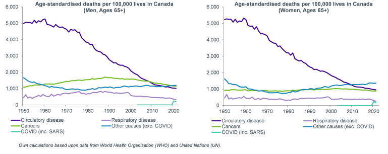 The Canadian Office of the Chief Actuary produced a comprehensive study of drivers of mortality improvements in Canada over the last 100 years in their 2021 paper Mortality Projections for Social Security Programs in Canada, which we heartily recommend. Below we summarize some key themes that have implications for using historical data to project near term and long-term improvement rates.