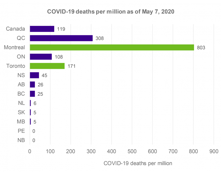 If we look at the number of Canadian COVID-19 deaths by province, we see that Quebec has by far been the hardest hit. The following chart shows COVID-19 deaths per million by province, as well as for Montreal and Toronto, as of May 7, 2020.
