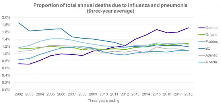There are different theories regarding why Quebec has been hit so hard. One likely contributing factor was that Quebec’s spring break occurs earlier than much of Canada. Many Quebecers were travelling the first week of March when COVID-19 was spreading between travelers but had not fully escalated in Canada. Vacationers returning to Quebec were going about their normal life as self-isolation measures for travelers returning to Canada only came into effect March 12th. Another key factor is the large proportion of Quebec seniors living in seniors’ residences and long-term care facilities, which is among the highest of all provinces. Additionally, Quebec has had higher mortality due to other respiratory illnesses (i.e., influenza and pneumonia) in recent years, as highlighted by the following chart.