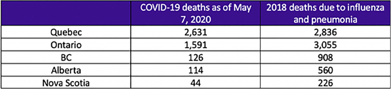 Source: COVID-19 Canada Open Data Working Group data as of May 7, 2020 and Statistics Canada data for leading causes of death by province.