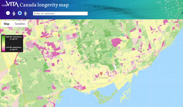 Club Vita is committed to providing research and tools to stakeholders interested in the health and financial security of our seniors. Today we are publicly releasing an interactive map that illustrates the level of life expectancy of Canada’s retirees depending on where they live. It has been created by analyzing the longevity experience of 750,000 defined benefit pensioners by postal code groupings. Postal code provides information on the geographic area, lifestyle, affluence and socio-economic status of those who live in a community. This map can be used by pension plans, academics, insurance companies, and other organizations in Canada, to support their own analysis and research, as well as by any individual that wants to better understand the longevity of those living in their community.