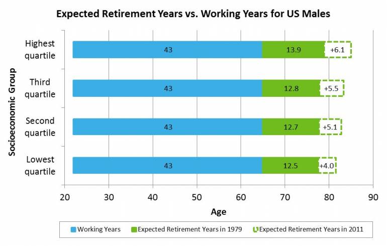 he CCR research examined gains in U.S. life expectancy between 1979 and 2011 for people in different socioeconomic groups. According to the findings, life expectancy for males at age 65 improved by more than six years (or 44%) in the highest socioeconomic quartile, but by just four years (or 32%) in the lowest quartile. This means that a two-year increase in retirement age offsets half the increase for the lowest socioeconomic quartile over the past 30 years but only one-third of the increase for the highest quartile.