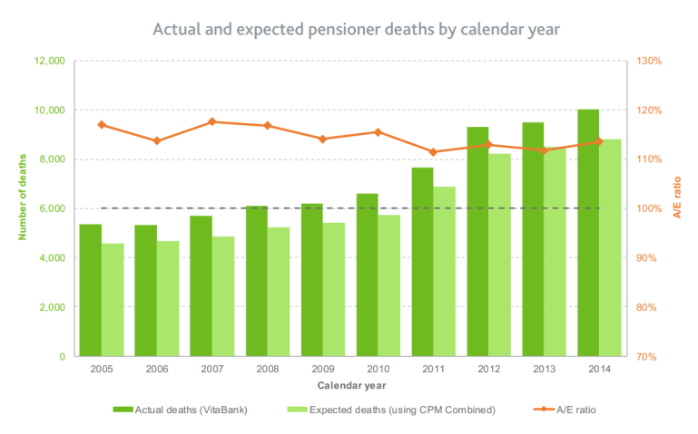 The chart below compares the actual number of pensioner deaths in VitaBank (dark green bars) to the expected number of pensioner deaths based on the CPM Combined mortality table (light green bars), which combines both public-sector and private-sector data in the CPM study. As can be seen, VitaBank’s actual deaths are consistently higher than the expected deaths. And the actual-to-expected ratio (A/E ratio) – the orange line – is greater than 110% over the entire period.