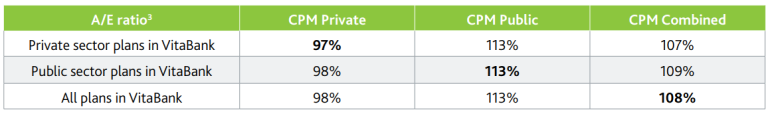 While a comparison based on the number of pensioner deaths is helpful and easy to understand, a more robust analysis is possible by including survivors and accounting for the pension amounts of those that have died. The table below compares the A/E ratio for private – and public – sector plans within VitaBank to the CPM Combined, Private and Public assumptions after including survivors and accounting for pension amounts.
