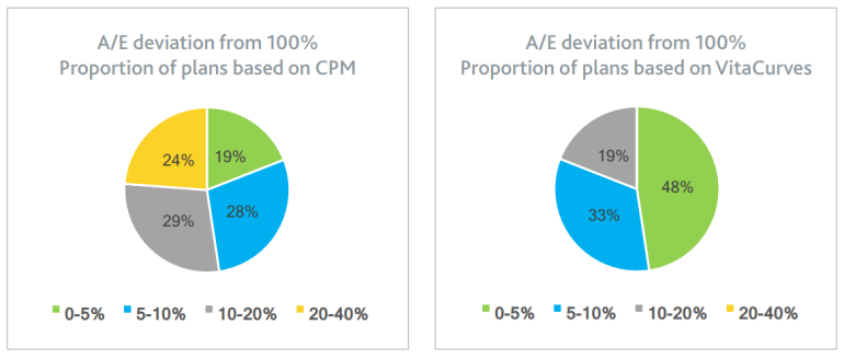 The chart below (left) shows how well the CPM mortality tables fit each plan that submitted data to Club Vita Canada4 . The optimal result is that the actual deaths equal that expected by the CPM mortality tables, for an A/E ratio of 100%. The poorer the fit, the more different the A/E ratio from 100%. This chart shows that the CPM mortality tables only fit well for a small proportion of plans (e.g., only 19% have an A/E ratio from 95% to 105%).