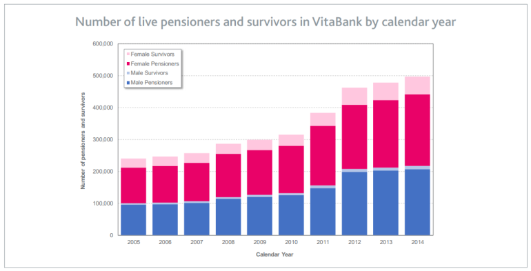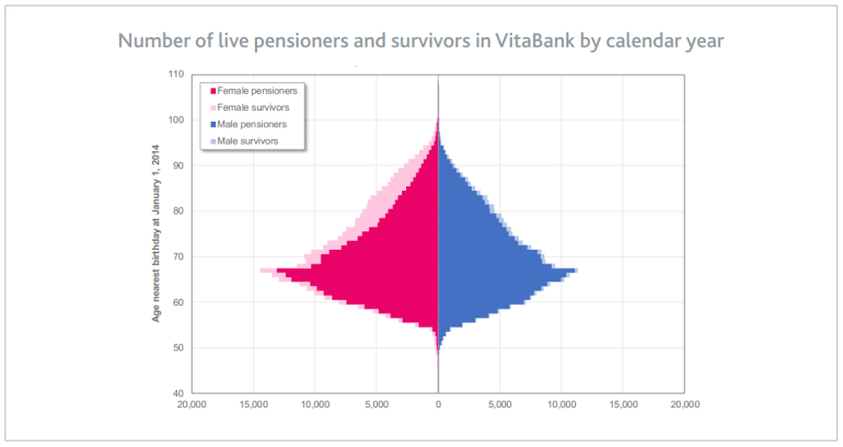 A large amount of data on living and deceased plan members is critical to longevity analysis. At the end of 2014, there were 497,000 living pensioners and survivors in VitaBank. And over all historical years, VitaBank includes approximately 125,000 deaths recorded.