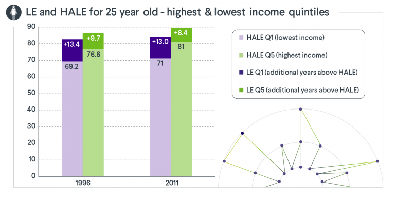 The charts below show the LE and HALE from age 25, as measured by Statistics Canada based on 1996 and 2011 Canadian Census data for the highest and lowest quintiles by income.