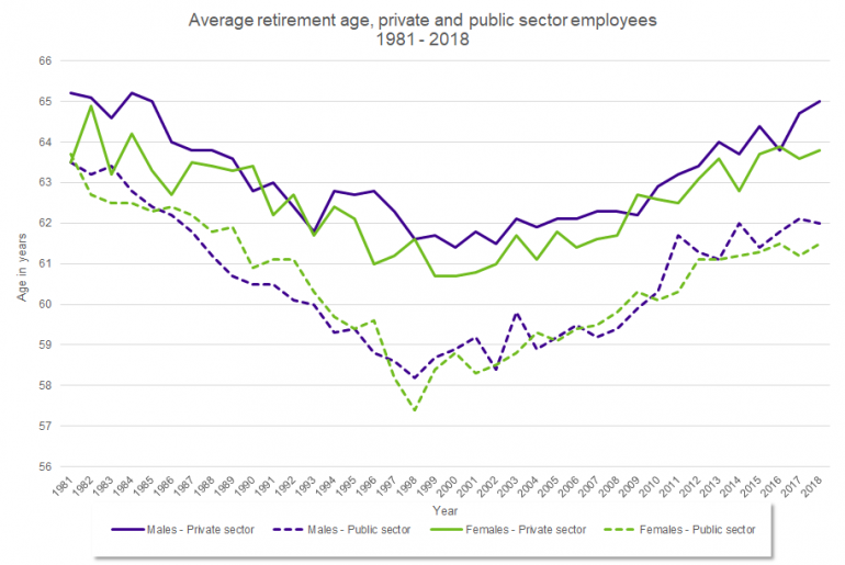 In 2018, the average retirement age in Canada was 64.4 in the private sector and 61.7 in the public sector (with some variation between males and females). Over the last 20 or so years, the average retirement age in Canada has been increasing. In the preceding 20 years or so, the average retirement age had been decreasing. The result of this is that the average retirement age today is not too different to that 40 years ago.