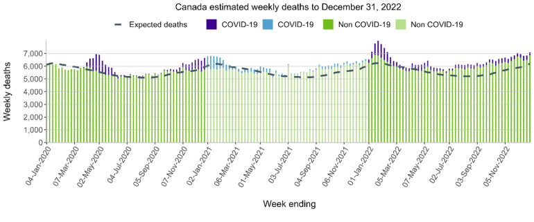 The chart below shows the estimated weekly deaths between 2020 and 2022 in Canada. The dotted line depicts the deaths in those weeks that were expected before the pandemic, calculated and published by Statistics Canada based on 2016-2019 data. Excess deaths are all deaths above the expected deaths dotted line in the chart. As depicted in the chart, excess deaths peaked at the beginning of 2022, briefly decreased in February-March 2022 and increased to persistently elevated levels for the remainder of the year.