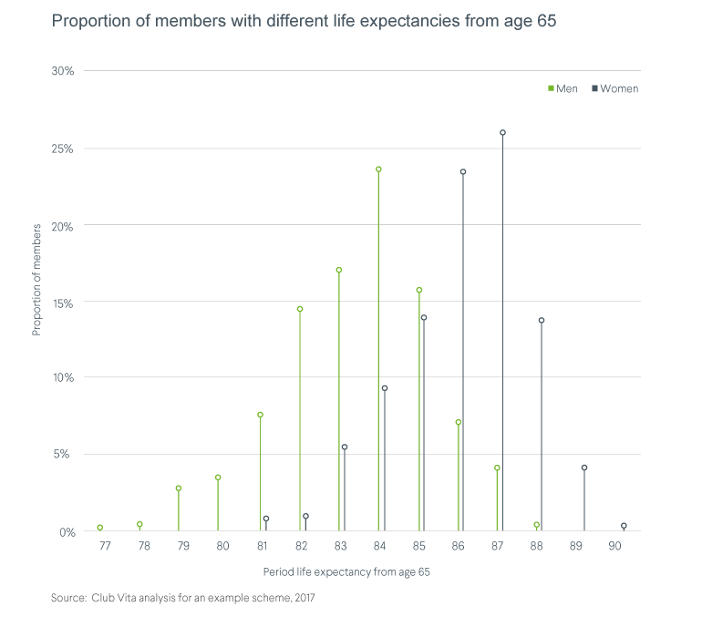 We only collect data fields that have been shown to have statistically significant effects on life expectancy. We regard our data request as the minimum viable items. This richness of data allows us to distinguish large differences in life expectancies within a single scheme’s pensioner population. Below is a chart showing how these life expectancies differ within a scheme: