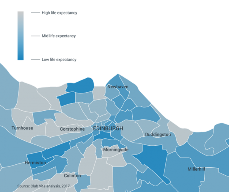 Whilst it is generally true that life expectancy is higher in the south and in rural areas, if you zoom in closer, you find that people with high and low life expectancy are dotted around the country often in neighbouring areas (see the map of Edinburgh below), for example.