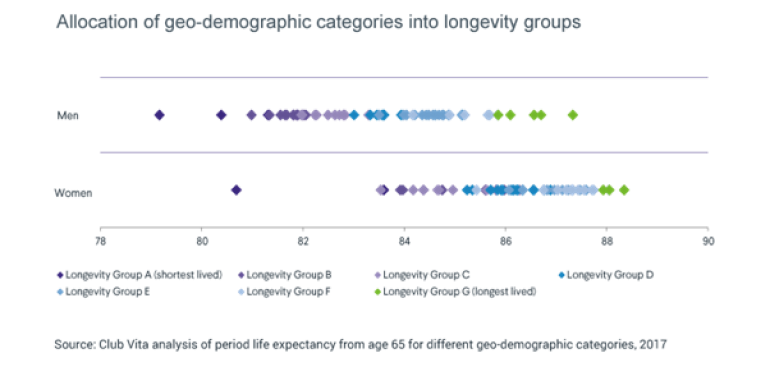 We regard postcodes as a proxy for both your affluence and your lifestyle. Importantly, as well as postcodes, we have also successfully collected salary before retirement for the majority of our pensioners. In combination, salary and postcode create a more predictive model than postcode does on its own. This is one of the reasons why Club Vita’s model explains a life expectancy variation of over 10 years, wider than other models.