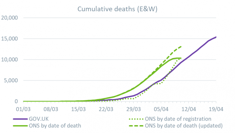 While there are (known) issues with the government figures, as they exclude deaths outside of hospital (in England), they have the advantage of being much more up to date – while we only have ONS statistics to 10th April, we have government values up to 19th April (as shown by the prolonged purple line in the chart).