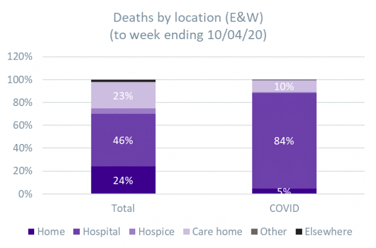 Although the corresponding figures in Scotland (published by the NRS) are a bit different (based on deaths to 12 April) – where only 62% of COVID-19 deaths were in a hospital setting, with around a quarter in care homes.