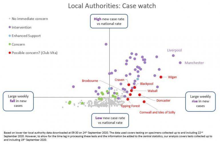 - There is likely to be concern at the rising cases in Broxbourne, Cornwall and the Isles of Scilly, Doncaster, Epping Forest and Walsall. Whilst they may not be flagged in this week’s PHE watchlist, if cases continue to rise rapidly in these areas then restrictions may be considered appropriate. It is notable that this list includes areas not just in northern England, but also neighbouring areas in the South East (Broxbourne and Epping Forest) and also the far South West