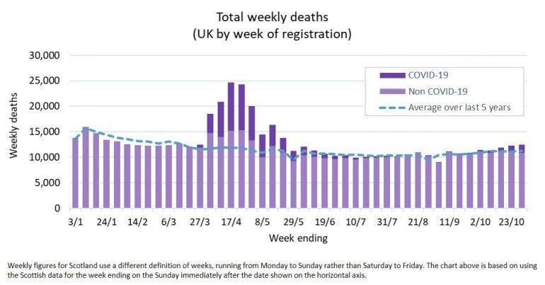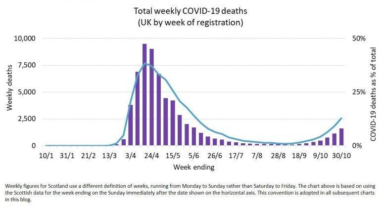 Since our recent update on weekly deaths, England has gone into a second nationwide lockdown, while Wales has just come out of its two week “firebreak”, with Northern Ireland’s four week “circuit breaker” due to end this Friday (13th). Meanwhile, Scotland continues its own tiered alert system of regional restrictions, having so far resisted imposing nationwide restrictions.