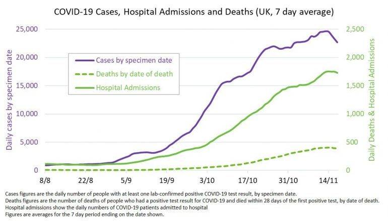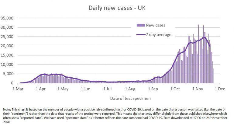The nationwide lockdown in England came into force on 5th November and is due to end on 2nd December, to be replaced by a return to an albeit stregthened three tier system. Encouragingly case numbers appear to be beginning to fall over recent days, suggesting the tighter restrictions may be having the desired effect.
