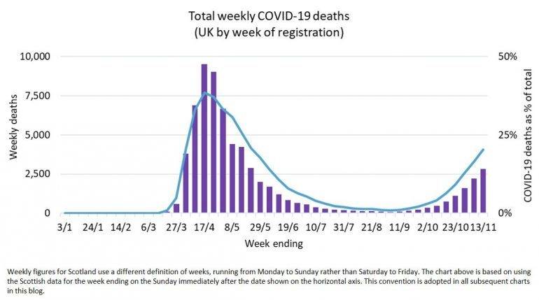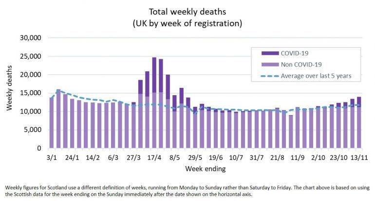 The latest statistics from the ONS include detailed breakdowns of deaths registered in England & Wales up to 13th November. In particular, they identify deaths where there is any mention of COVID-19 on the death certificate. Combining this information with similar data from the corresponding statistical bodies in Scotland and Northern Ireland, we can examine emerging patterns in the data.