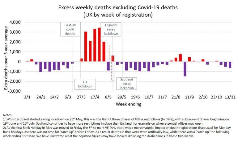 Given the statistical ‘noise’ in weekly death figures, caution is required when looking at this data over relatively short periods. However, the downward trend seen over the past few weeks is nonetheless welcome, particularly at a time of rising COVID-19 deaths. It will, however, be important to monitor how these figures evolve over the next few months, where deaths would be expected to increase in any given year over the winter.