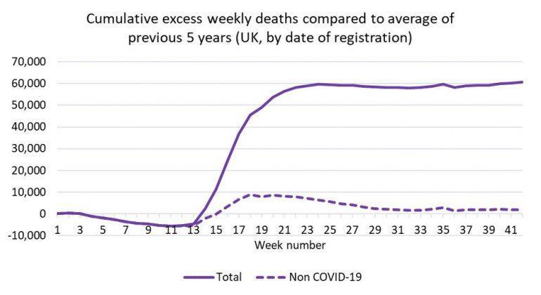 After a relatively light start to the year, cumulative deaths in the UK rose rapidly over April and May, and by mid-June cumulative deaths for the year to date were almost 60,000 higher than the corresponding weekly average values over the past 5 year (the solid line in chart below). For the past few months the cumulative excess mortality has been relatively stable, as weekly deaths have been closer to average levels. With just 10 weeks of the year remaining, the ‘excess’ deaths for the year to date are of the order of 10% of the typical annual total for the UK.