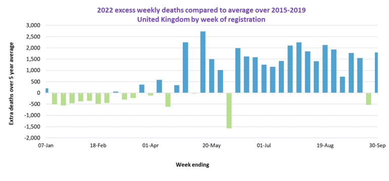 After a relatively light start to 2022, cumulative deaths in the UK rose rapidly from May onwards (the solid green line). By the end of September, the cumulative ‘excess’ UK deaths exceeded 20,000 – this compares to over 80,000 and 60,000 ‘excess’ deaths over 2020 and 2021 respectively (comparing the solid green line with the solid purple and solid blue lines).