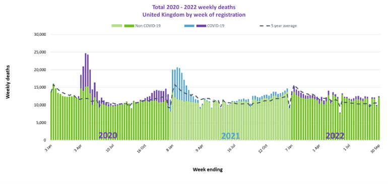 Sources (data available at 14 October 2022) : ONS weekly deaths data, NRS (Scotland) weekly deaths data, NISRA (Northern Ireland) weekly deaths and GOV,UK daily deaths for UK & Nations.