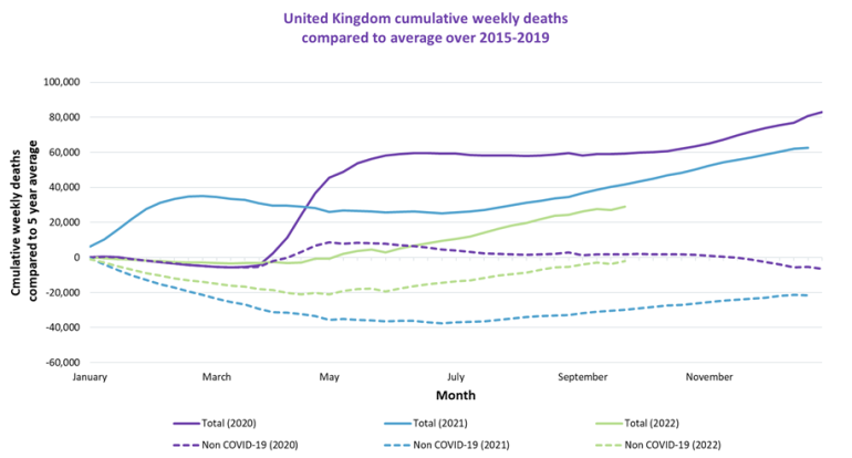 The next chart shows the cumulative weekly deaths in the UK for 2020, 2021 and 2022, relative to the average over 2015 to 2019. Note that the aging UK population means we would expect the number of deaths to increase slightly each year, all else being equal.