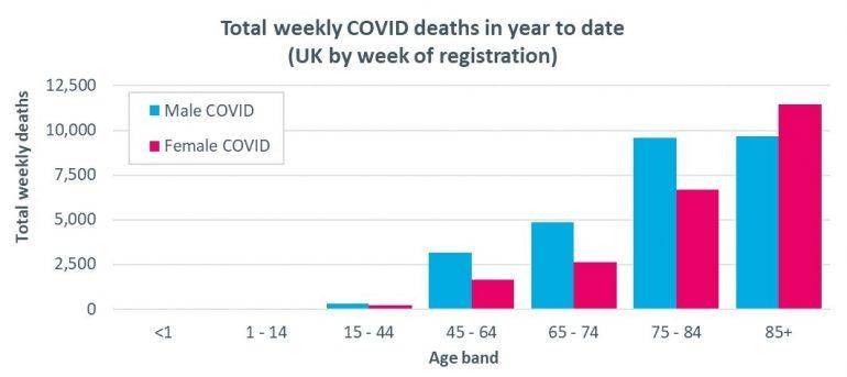 We can see that, for both men and women, COVID deaths are more heavily weighted towards the oldest ages than ‘non COVID’ deaths, while for all but the highest age band the number of deaths for men exceeds the corresponding number of deaths for women.