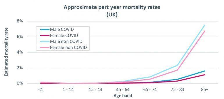 It has been well documented that COVID-19 deaths have primarily occurred in older people. However, this is also true of deaths generally – mortality rates typically increase rapidly with age. The chart below looks at the split by age band of registered deaths in the UK over the year to date, for those which mention COVID on the death certificate and those that do not.