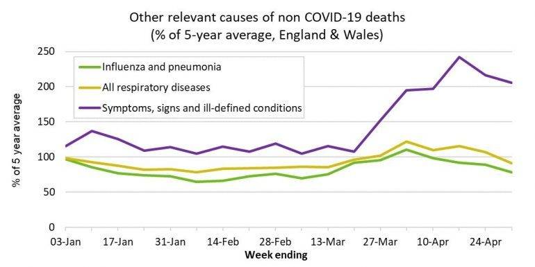The ONS have also published more detailed analysis of the cause for those deaths which do not mention COVID-19 on the death certificate (i.e. the unseasonably high excess weekly deaths shown by the red bars above), covering the period to 1 May in England & Wales.