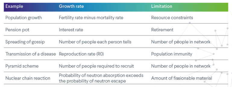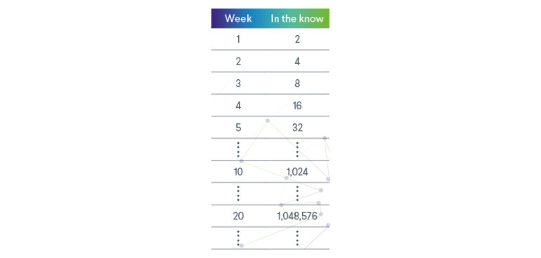Using a different example to picture this, suppose one person knows a secret. After one week they tell someone else. The following week, both tell one more person. The following week all four tell one more person each, and so on. What started off as a small group of people will in fact reach the thousands after 10 weeks and will clear a million after 20 weeks. This is exponential growth.