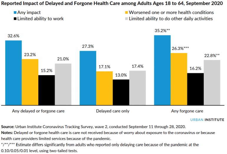 Depending on what health care has been delayed or forgone, the effects can be small or large. The chart below shows that the reported impact of missing health care during the pandemic has been significant for some people: