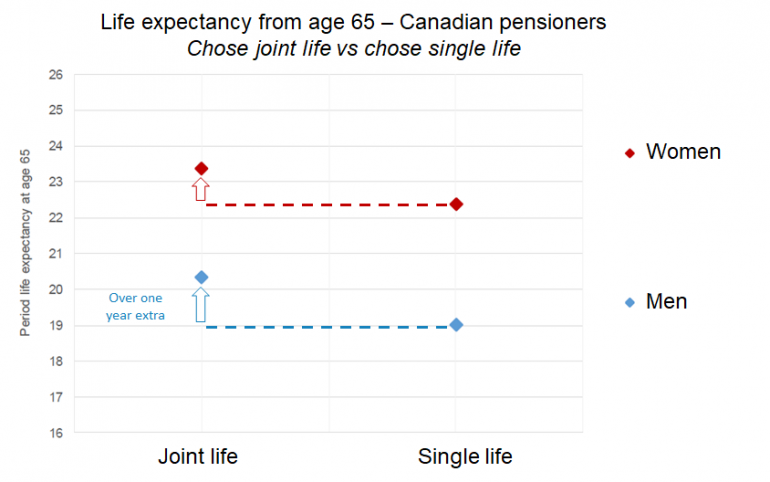 In contrast, participants in Canadian and US DB pension plans don’t automatically get a pension payable to their spouse. Instead the individual choses whether to take the pension in full payable to just themselves (“single life”), or to take a reduced pension with the continuation of (partial) pension upon their death to their spouse (“joint life). This difference means we can use the Canadian data to explore the “positive” impacts of companionship on longevity.