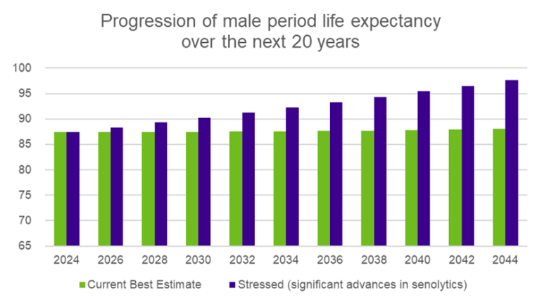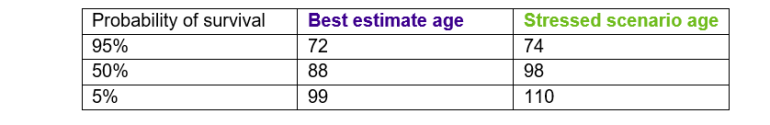 Under current best estimate projections, a medium/high socio-economic 65-year-old man in 2024 has a 5% chance of living to 99, under our stressed scenario this increases to 110.