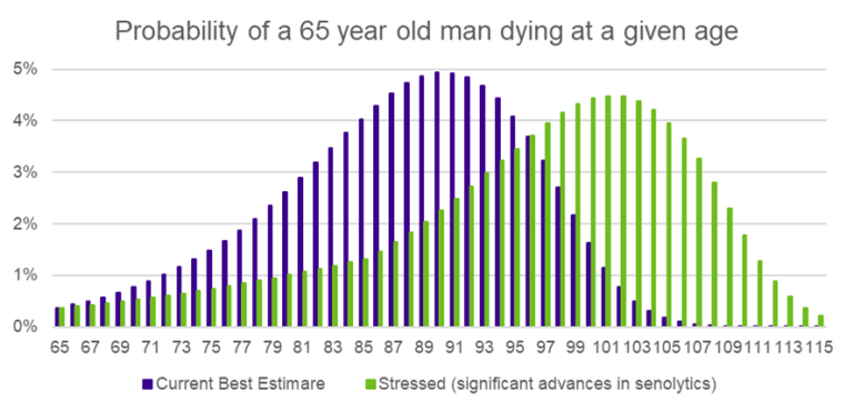 If many people start achieving significantly longer lifespans, there could be far reaching effects both on society and on our financial institutions. There are a number of realistic scenarios that could lead to significant increases in life expectancy. And, even if they do not represent a best estimate of the future, they should not be ignored by those managing future longevity risk. The significant advances in senolytics scenario explored here could result in increases in liabilities in the region of 25% and lead to a significant number of individuals living much longer lives. Do you think we are prepared for such a risk? If you are a holder of longevity risk (a sponsor of a pension plan or an insurer whose annuity book is not hedged against longevity), you might want to consider whether there is value in hedging longevity.