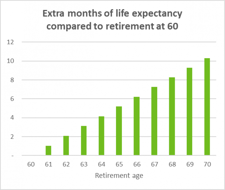 Perhaps! There appears to be some correlation between working to an older retirement age and living a longer life. The chart below shows the extra years of period life expectancy (from a constant age) enjoyed by pensioners retiring from ages 60 to 70. As we can see from the chart each extra year in work broadly corresponds to an extra 1 month of life expectancy.
