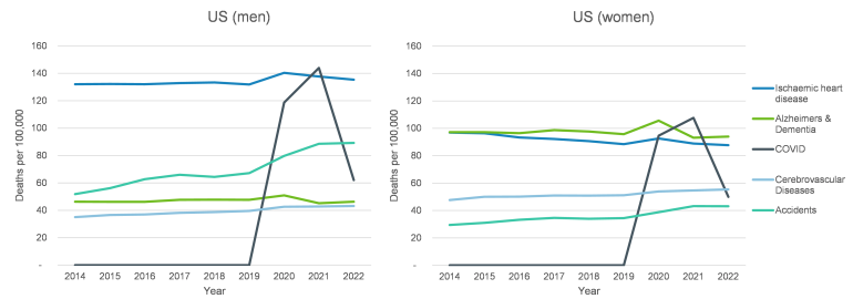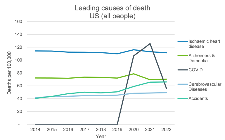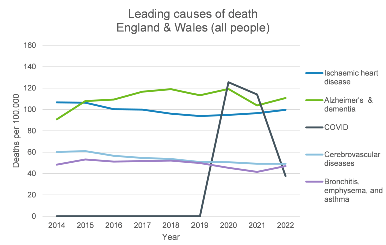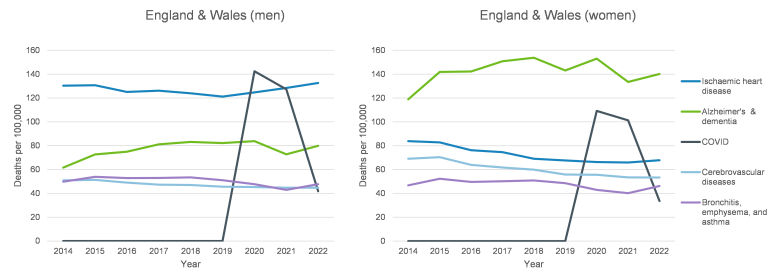 The charts below show the top 5 causes of death in England and Wales and in the US (using the WHO’s 2016 grouping of causes) from 2014-2022. The green line represents deaths due to Alzheimer’s and dementia, and contributes the largest number of deaths per 100,000 in England and Wales, and the second largest in the US.